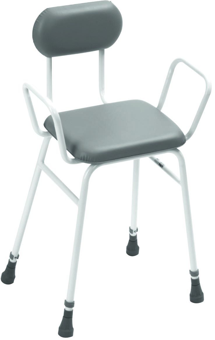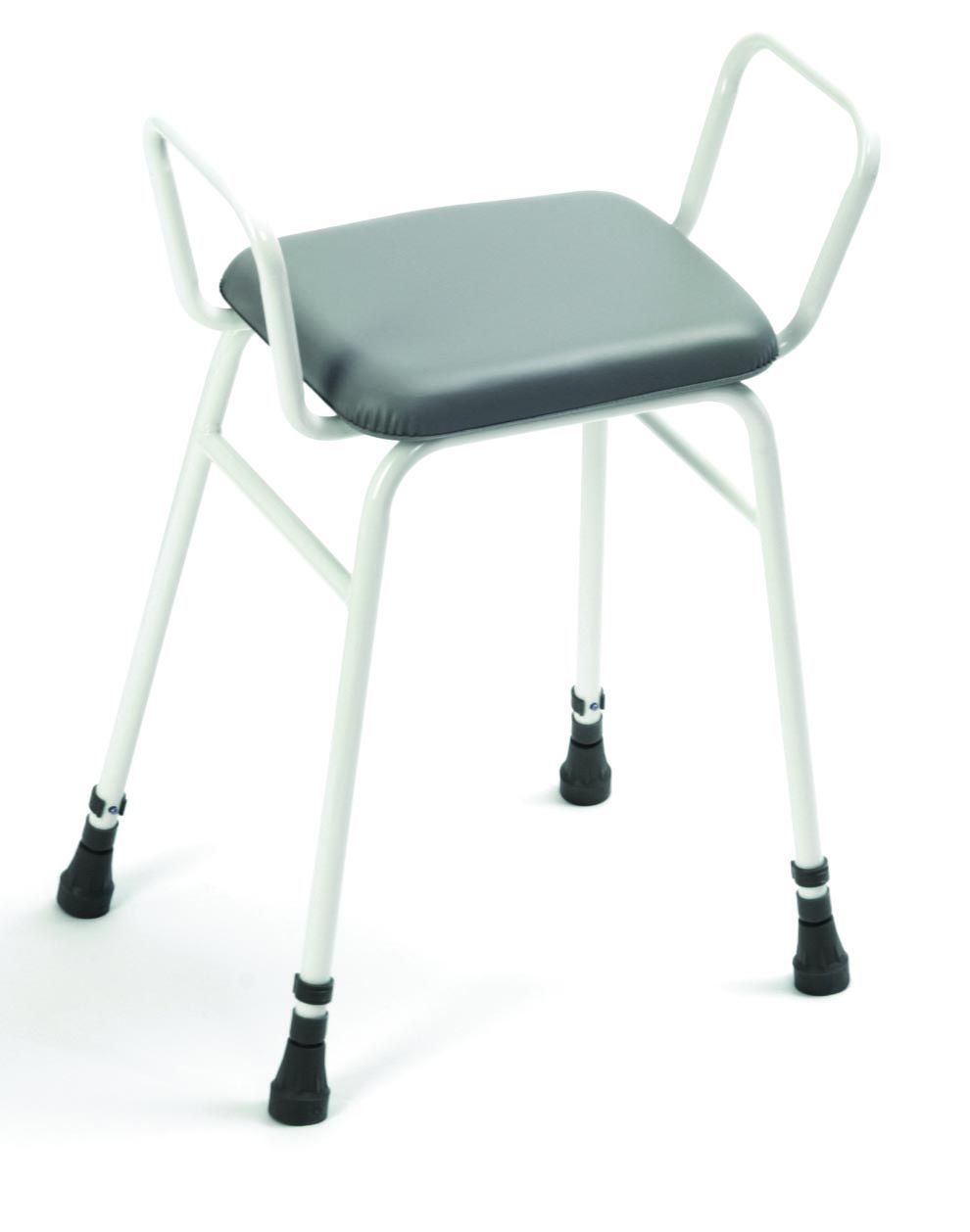 Depending on your requirements, the mobility aid can be purchased with, or without, arms and back. The grey vinyl seat of the daily living aid is fully sealed for ease of cleaning and sanitation, while the non-slip rubber feet prevent slipping on wet surfaces.