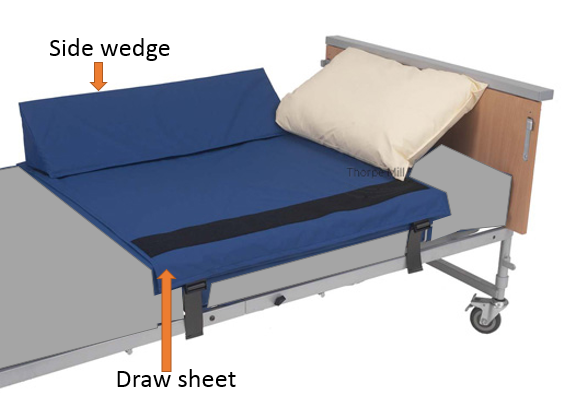 The Bedside Cot Wedges are daily living aids that are raised to resist rolling, even with force. They are cushioned for comfort and lined with wipe-clean fabric for easy cleaning and optimum hygiene. The wedges are held securely in position by the draw sheet via two hook and loop strips. The wipe-clean draw sheet itself is held in place by straps, which have quick-release buckles for ease of use.
