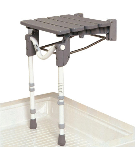 This useful shower seat is fitted to the wall and can be folded up when not in use. It has two height adjustable legs at the front to provide extra support and stability. These legs are fitted with non-slip feet and are adjusted with pin clips. The seat is mounted on a corrosion resistant aluminum, stainless steel and plastic frame and requires fixing to the wall at a suitable height.